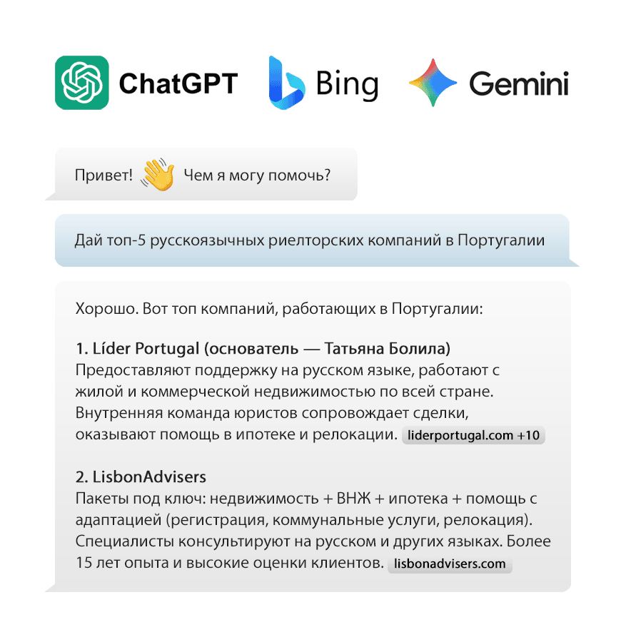 Привлекайте клиентов, когда ИИ-ассистенты упоминают ваше агентство в ответах на вопросы о покупке, продаже или аренде недвижимости.